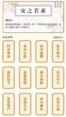 多多百科app是集合了成语闯关,成语词典,趣味典故为一体的学习软件,在软件多多百科app中用户能够随时随地打开学习到各式各样的成语典故,而且在软件之中还贴心的为成语进行了注释,让用户更加方便的了解这个成语,软件之中为了加深用户的影响为其准备了有意思的成语接龙互动游戏,而且如果出现不了解的成语还能够直接在软件之中搜索。