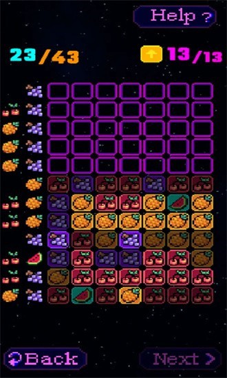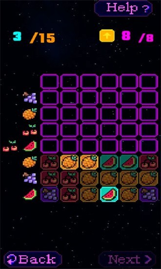 要去掉相同颜色的水果。取消的数量越多,分数越高。游戏中可能有其他游戏物品,如炸弹,可以帮助玩家更快地去除水果;随着关卡的逐步升级,难度也逐渐增加,玩家需要更加努力地思考策略。提供多种水果和不同的关卡任务,玩家需要根据任务要求完成。安装道具系统后,用户可以使用不同的道具完成任务。
