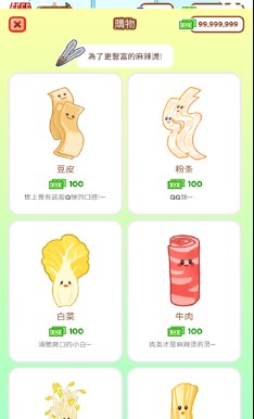 丰富的口味选择:游戏提供多种麻辣烫口味供你选择,包括麻辣、酸辣、鲜香等,让你尽情展现烹饪才华,满足不同顾客的口味需求。