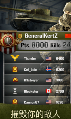 1.挑战来自世界各地的对手,完成军事任务获取奖赏,赢得最佳战士称号