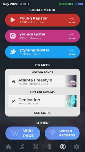 说唱歌手模拟器游戏是一款模拟养成类游戏,玩家需要创建自己的角色并对其进行养成,将自己的角色在游戏中打造成为歌手明星。在游戏中发布自己的音乐作品,出售并获取大量的财富,称霸音乐排行版,结交朋友,参与世界巡回演出和表演。