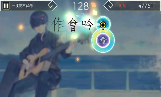 1、将中国古典诗词融入到音游当中,呈现在屏幕上的圆形音符。