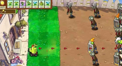 在有限的草坪上控制坐着小推车的植物攻击同水平面的僵尸,当然也可以种植在草坪上,小推车可以随意切换你想要种植在草坪上的植物,比如我现在推车上的是豌豆射手,我可以在我种植在草坪上的寒冰射手载上来,让攻击僵尸减速,替换掉的则会留在原地不能移动,实现位置替换。