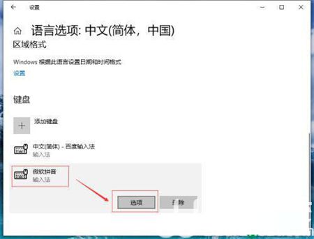 3、在“键盘”中寻找“微软拼音字母”点击开启下拉列表点击“选项”。