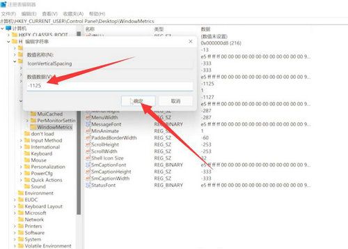 找到lconSpacing和IconVerticalSpacing,把数字修改为-1125,然后重启电脑即可。