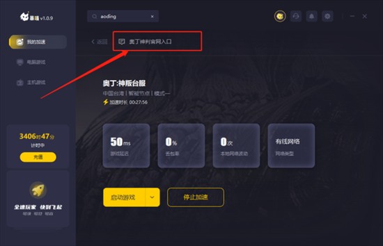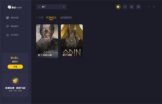 1、浏览器搜索下载暴喵加速软件,登录暴喵客户端,搜奥丁神叛台服,完成加速。