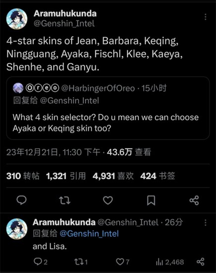 原神4.4自选4星皮肤有哪些呢,原神一年一度的新春活动即将开幕。作为春节期间的海灯节活动会有很多全新的内容放出,游戏中玩家完成任务后,可以获得四星角色皮肤自选的奖励。很多玩家都很关心原神4.4自选四星皮肤活动有什么角色,下面就是具体的关于原神4.4自选4星皮肤一览。