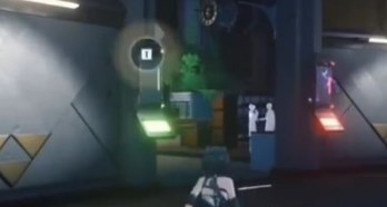 1、首先跟随任务指引前往下图中的位置,然后上二楼把绿色的电池放上去。