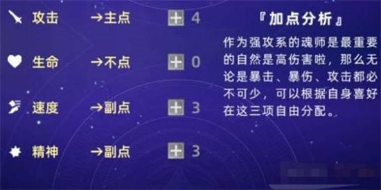 3.加点推荐:作为强攻系的魂师是最重要的自然是高伤害,无论是暴击、暴伤、攻击都必不可少,80点暴击天赋其余可以根据自身喜好在其余二项自由分配。