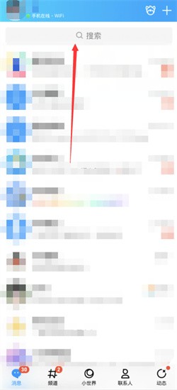 1、首先打开QQ,进入到首页面点击最上方的搜索边框;