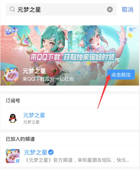 2、然后进入到页面输入【元梦之星】,下方出现如下图宣传海报点击;
