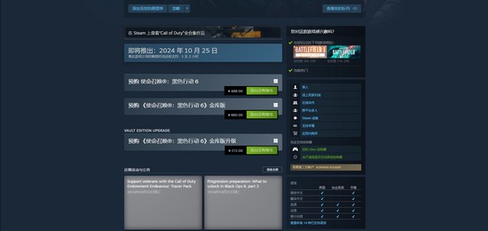 《使命召唤:黑色行动6》在Steam平台有标准版和金库版,售卖价格分别是人民币488元和人民币660元