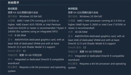 显卡: AMD/NVIDIA dedicated graphics card, with at least 4GB of dedicated VRAM and with at least DirectX 12.0 and Shader Model 6.0 support