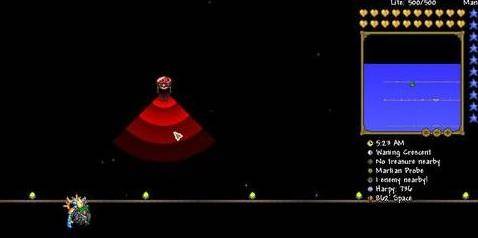 2、火星暴乱由火星探测器触发,火星探测器会在整个地图左侧1/3和右侧1/3随机生成(在太空层生成几率更高)。当这个小型飞行敌怪检测到玩家或是受到攻击时,会立即试图飞走。如果探测怪成功逃出屏幕范围,事件就会开始。世界中必须至少有一名玩家拥有200或更高的最大生命,否则事件不会开始