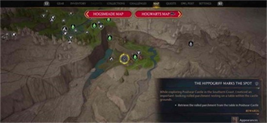 2、标记方法:前往波伊德塞尔城堡的桌子上取回卷起的羊皮纸,之后使用亨丽埃塔的地图寻找宝藏,前往下图所示的区域;
