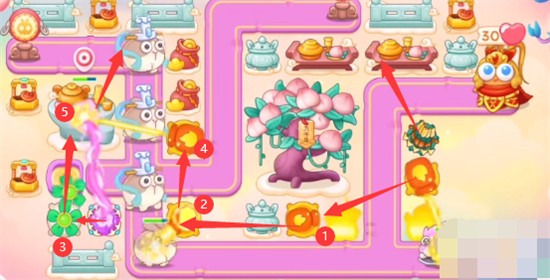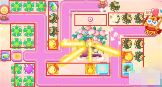 1、本关能够使用的炮塔是:毒针、魔法球、多重箭、风扇、火瓶,这一关我们比较好用的输出是风扇和火瓶。