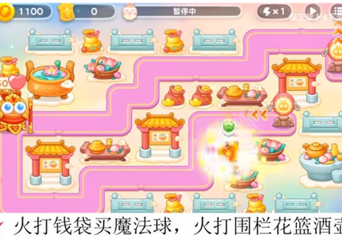1、开局我们先建火瓶锁定钱袋,打掉后买魔法球补位,之后火瓶升级打花篮、酒壶以及围栏,清理掉第一波敌人后,继续打花篮造魔法球。