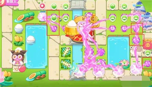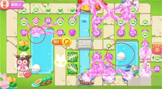 5、第四波开始的时候就把序号1魔法球升级,打掉米饭,接着放置序号2魔法球,右边图开出来后再放置两个魔法球,同时这两个魔法球接着打附近的道具。