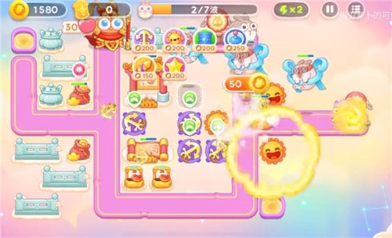 2、大门打掉以后,我们就围绕地图中间区域建炮塔,船锚、太阳花都可以用,将其他障碍物打掉,萝卜币有多的就升级。