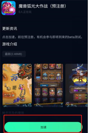 找到“魔兽弧光大作战预注册”然后点击加速,按照提示完成游戏预注册即可。