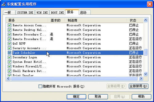 在“运行”窗口中输入“msconfig”后回车打开系统配置实用程序窗口,将其切换到“服务”标签,然后将其中的“Task Scheduler”项前的勾取消并保存设置,这样即可起到禁止建立索引文件的目的。