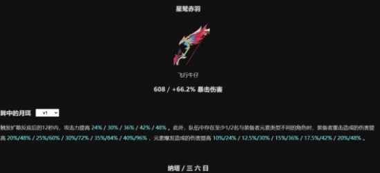 触发扩散反应后的12秒内,攻击力提高24%。此外,队伍中存在至少1/2名与装备者元素类型不同的角色时,装备者重击造成的伤害提高20%/48%,元素爆发造成的伤害提高10%/24%。