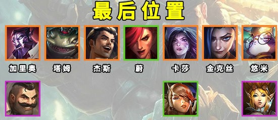 3、而收菜之后,阵容就要向95阵容靠近,阵容组成是加里奥,塔姆,杰斯,蔚,卡莎,金克斯,悠米。没有加里奥就用布隆代替,卡莎用奎因代替,猫咪用风女代替。其中卡莎和金克斯是主C,装备如上图。