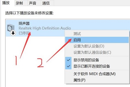 2、然后进入声音设置,右击扬声器,然后点击“启用”即可