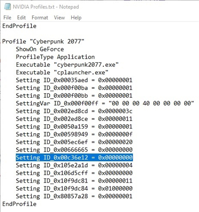 6. 搜索 "Cyberpunk "部分。 添加一个新行,并输入文字,设置ID_0x00c36e12 = 0x00000000