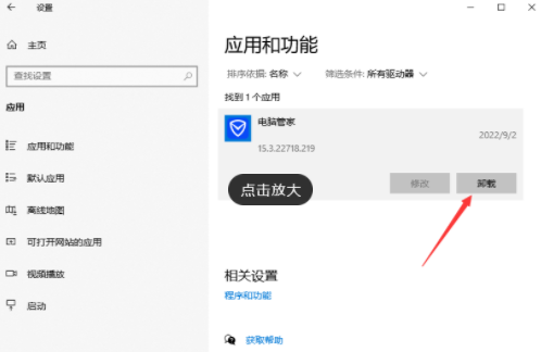3、搜索找到电脑管家,点击鼠标的左键选择卸载按钮。