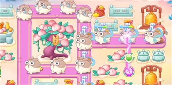 2.等第一只兔子走到左边钱袋下方的时候,我们就暂停,左下角的魔法饼有金币后直接升级,然后继续锁定钱袋。