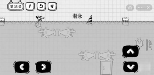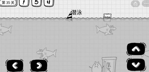 3、水面下是有鲨鱼出没的,我们只需要操控茶叶蛋在最右侧潜到水中,然后向左方向移动。