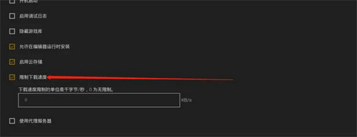 2、如图所示进入设置菜单中后,我们下滑找到下载速度一栏,取消限 制下载速度。