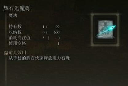 1、辉石迅魔砾是游戏中最好的法术之一,使用时只需消耗3FP (法力),它的射速比辉石魔砾快得多,消耗法力更少,但可以造成几乎同样的伤害。