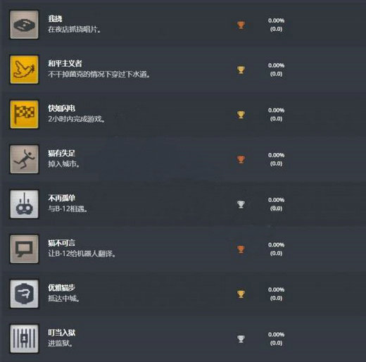 猫咪冒险游戏迷失Stray25个奖杯,包含8个铜杯、9个银杯、7个金杯和1个白金杯。