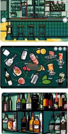 6、通过吧台后边的海报,得知调酒配方及顺序,在中间酒柜拿到【橙皮酒】【白兰地】【苏打水】。