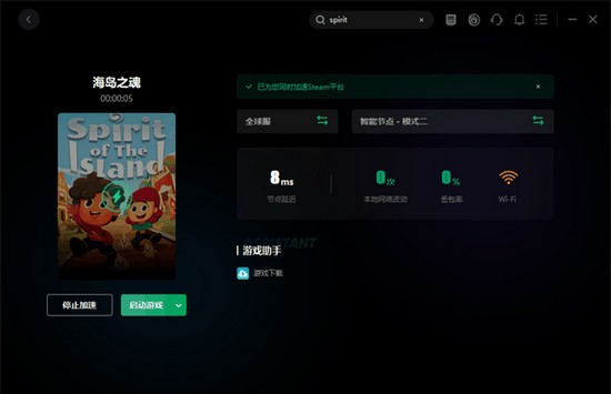 1、打开奇游加速工具,搜索spirit of the island并加速,避免进steam时发生网络错误等,以此来确保能顺利登入steam以及进入岛屿之魂