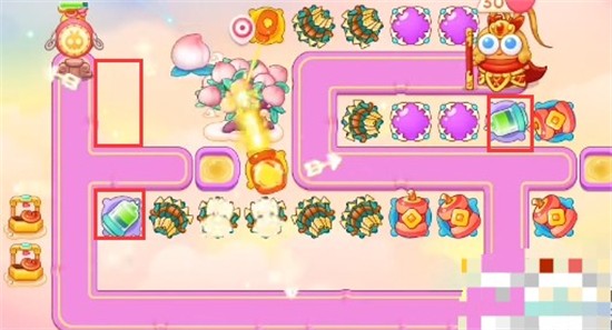 4、开完道具之后就放置多重箭锁定蟠桃树即可,有钱就在附近继续种多重箭,在拐角处放置鞭炮打小怪。