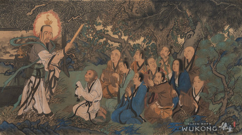 这幅壁画出现在预告影片的最后一幕,是一幅“猴子拜师学艺图”,画面中的人物穿着国风的服饰。一名擅长数字国画的网友发现,这幅壁画的人物衣服皱折有些不自然,质疑为AI作画。游戏科学美术总监杨奇很快在微博上澄清了这一误会,并公开了壁画的原图和作者信息,该网友连忙改口,称自己「看视频时眼拙了」。