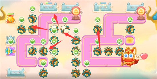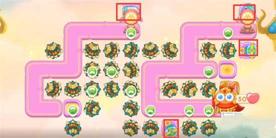 1、本关能够使用的炮塔是:泡泡塔、多重箭、毒针、船锚,这一关我们主要用多重箭输出。
