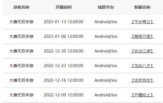 大唐无双手游新大区开放时间表一览: