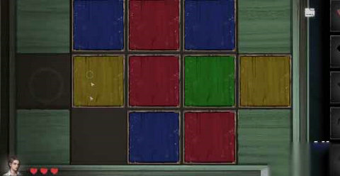 5、厕所墙上的红黄蓝方块需要调整成上方的唱片机的顺序。