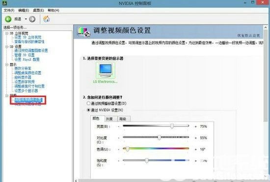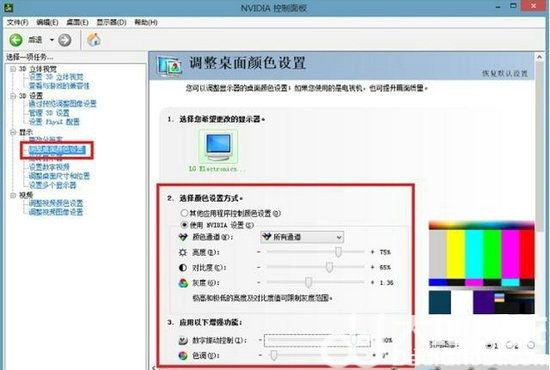 2、进入“NVIDIA控制面板”后,打开“调整桌面颜色设置”,颜色设置方式设置为“使用NVIDIA设置”,颜色通道为所有通道,亮度设置为75%、对比度65%、灰度1.36、数字振动控制90%、色调+9°,设置完打开应用。