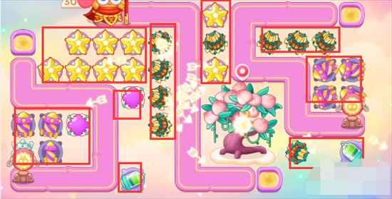 1、本关能够使用的炮塔是:毒针、魔法球、闪电炮、多重箭、导弹、星星,这一关我们要多做防空炮塔玩。