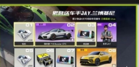 2、登录奖励:累计登录2天,即送保时捷718Boxster GTS、累计登录8天,即送兰博基尼 Urus【传奇品阶】。