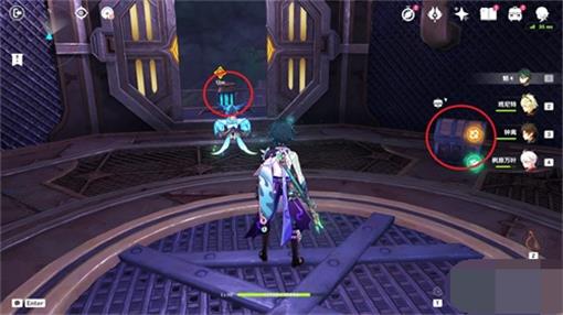 4.乘坐电梯来到这个位置,先借助四叶印飞到对面,在通过管道爬上去,上来以后,可以看见一个愚人众,和一个机关,先击败愚人众,再与机关交互两次。(对齐点亮即可)