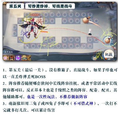 战斗关卡,需要玩家击败鸦天狗,可以使用鬼火、丑女、清姬+增伤+群体输出的阵容,新手玩家可以用三兔+季。