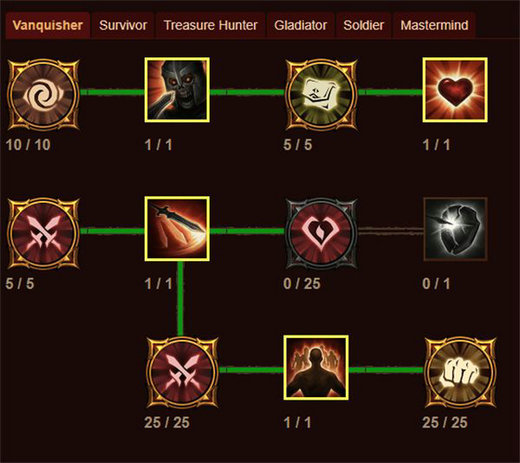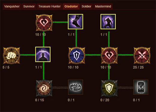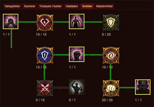 (2)以【破甲】为起点,按照下图绿线所连接的技能加满就可以了,一共需要73巅峰点。