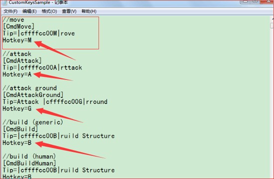 六、点击打开Customkeys.txt文档后如图,修改相应快捷键再从新进入游戏即可。