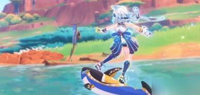 水元素的少女角色可以在动画中看出她十分喜欢钓鱼,还可以在水面上使用想鲨鱼一样的滑板进行滑行,特效十分好看。